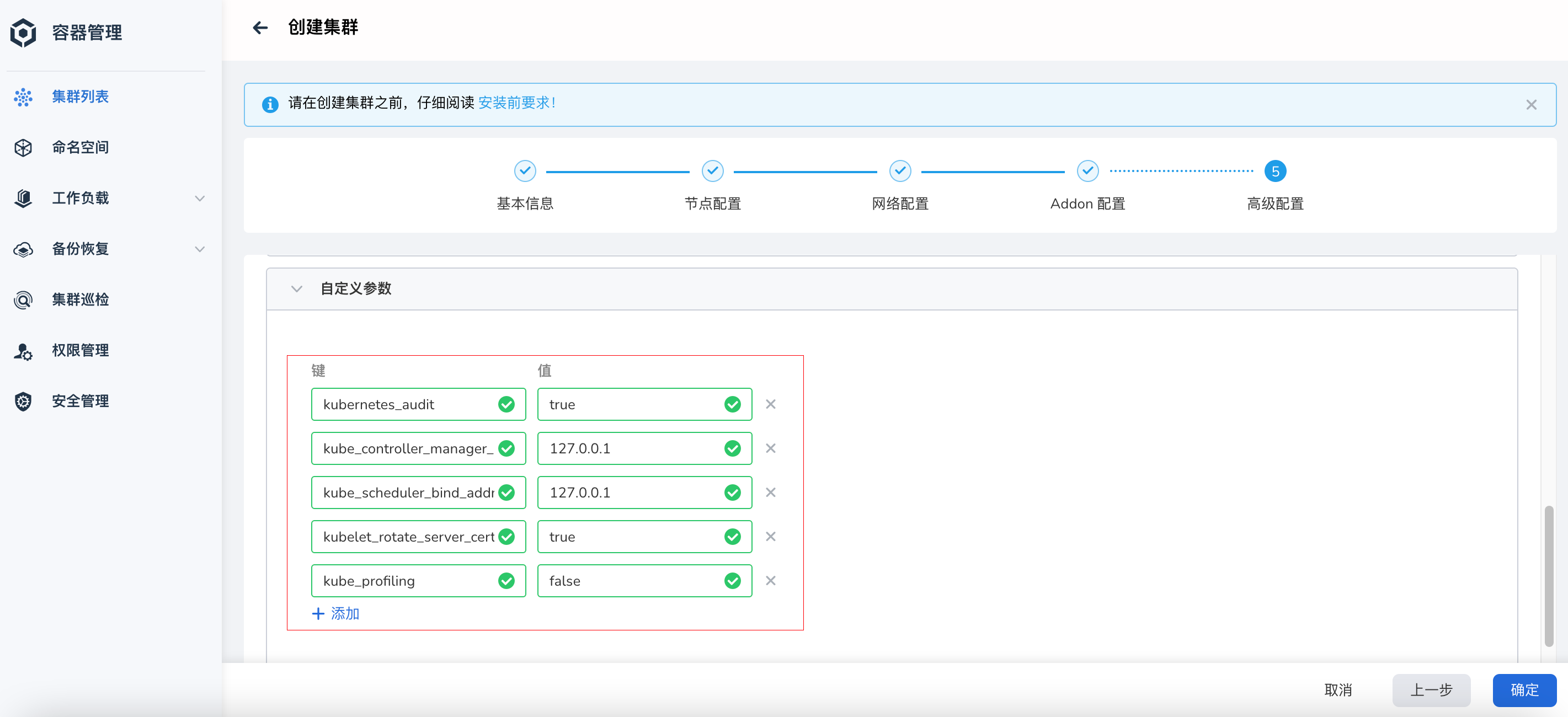 参考创建工作集群,在第 5 步自定义参数中定义扩展参数: